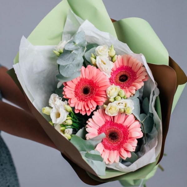 Букет с Герберой, Лизиантусом и Изумрудным Эвкалиптом в Яровом